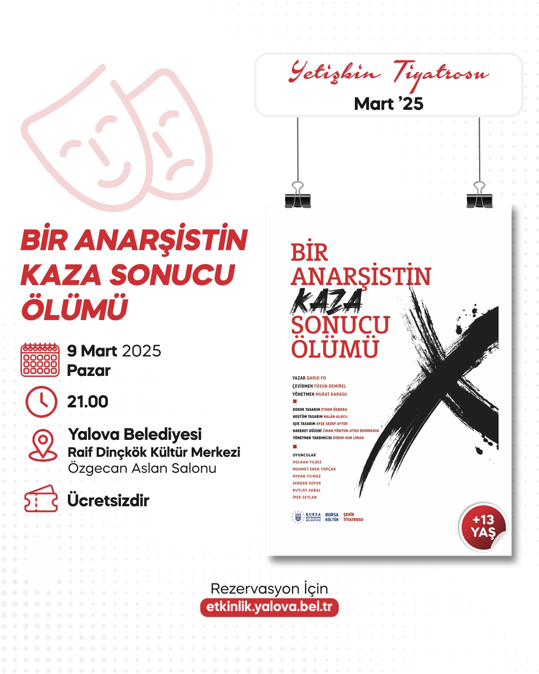 Yalova Belediyesi, 9 Mart Pazar günü saat 21.00’de, ünlü İtalyan yazar Dario Fo’nun yazdığı “Bir Anarşistin Kaza Sonucu Ölümü” adlı tiyatro oyununu Yalova halkı ile buluşturuyor.