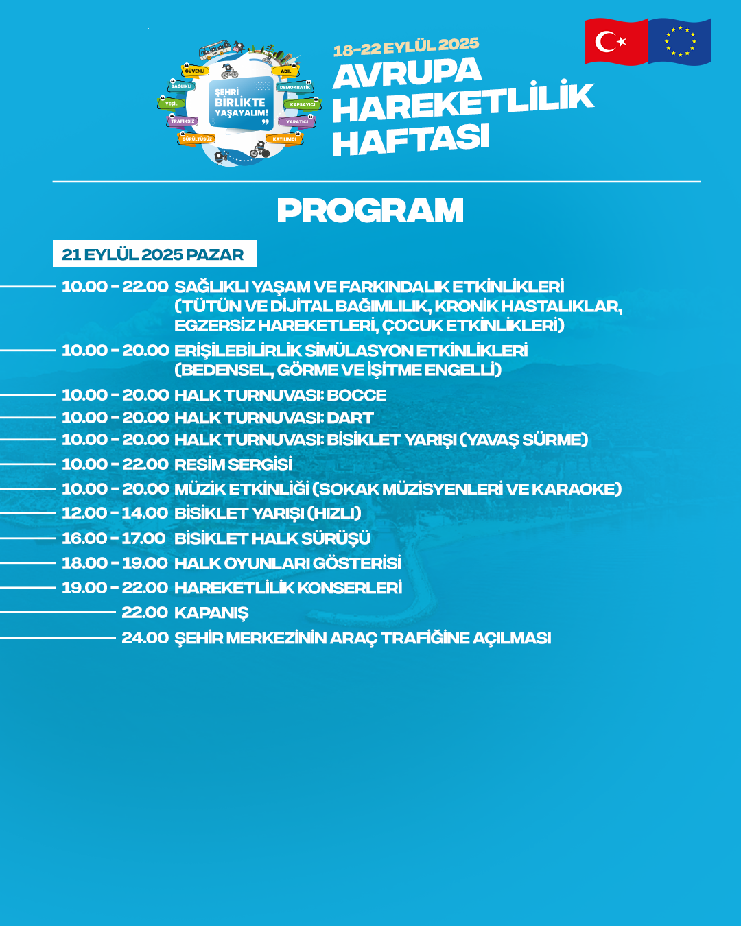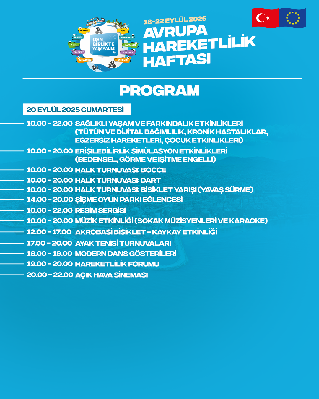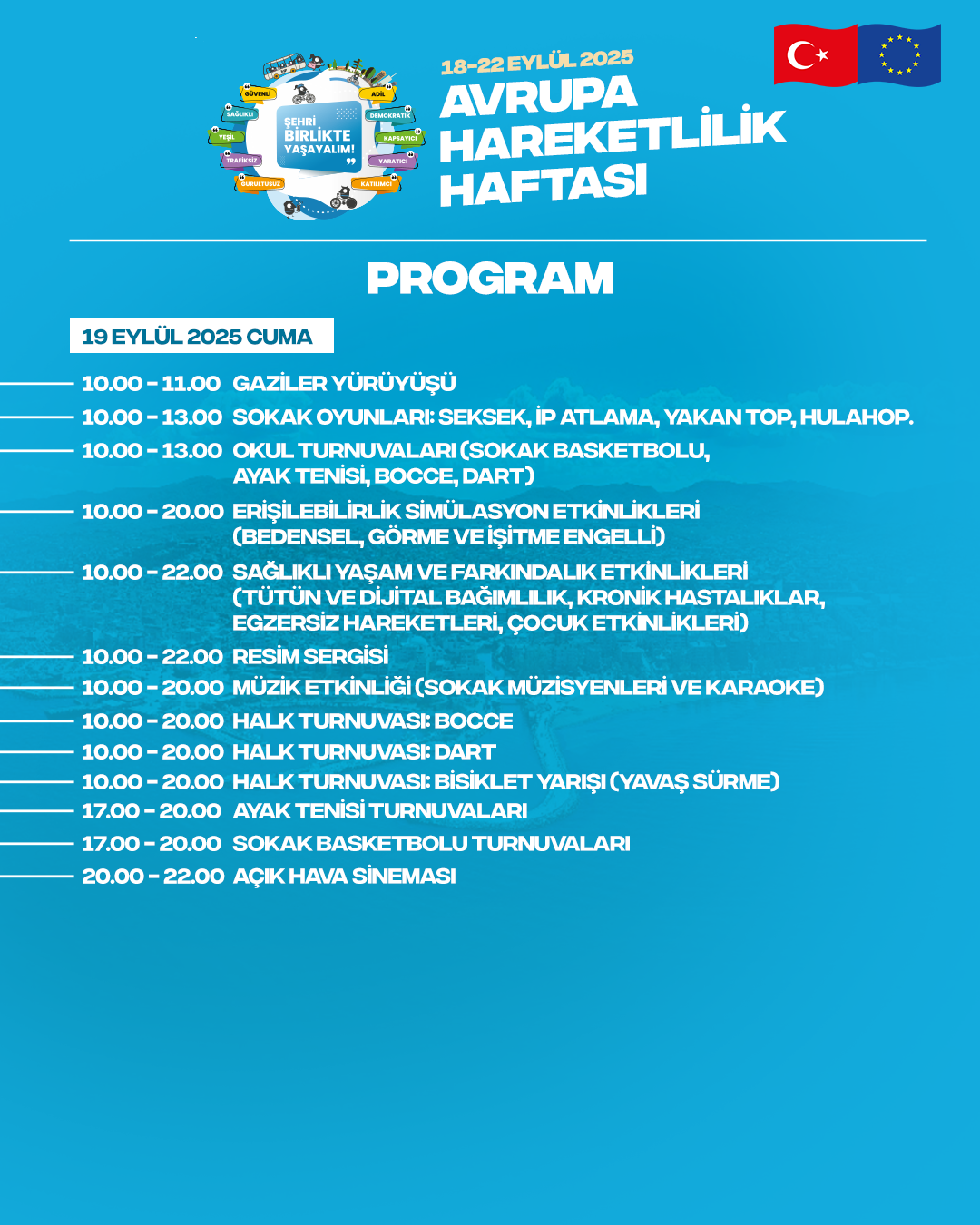 Program, 18 Eylül Perşembe günü saat 09.30’da yapılacak kortej yürüyüşüyle başlayacak. Hafta boyunca şehir merkezinde araç trafiği sınırlandırılarak, yayalar ve bisikletliler için güvenli alanlar oluşturulacak.