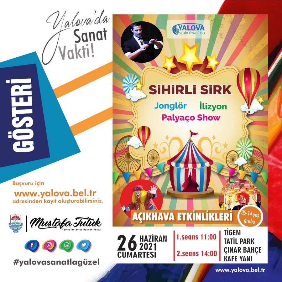 26 Haziran Cumartesi günü iki seans halinde TİGEM Tatil Park Çınar Bahçe Kafe yanında düzenlenecek olan açık hava etkinliğinin ilk seansı 11:00’da ikinci seansı ise 14:00’da yapılacak. Sihirli Sirk isimli programda jonglör, ilizyon ve palyaço gösterileri yer alacak. Pandemi önlemlerinde yapılacak olan gösterilere sınırlı sayıda katılımcı alınacak. Yapılacak olan açık hava gösterilerine katılmak isteyenler www.yalova.bel.tr adresinde duyurular bölümünü tıklayarak form doldurmak zorundalardır.