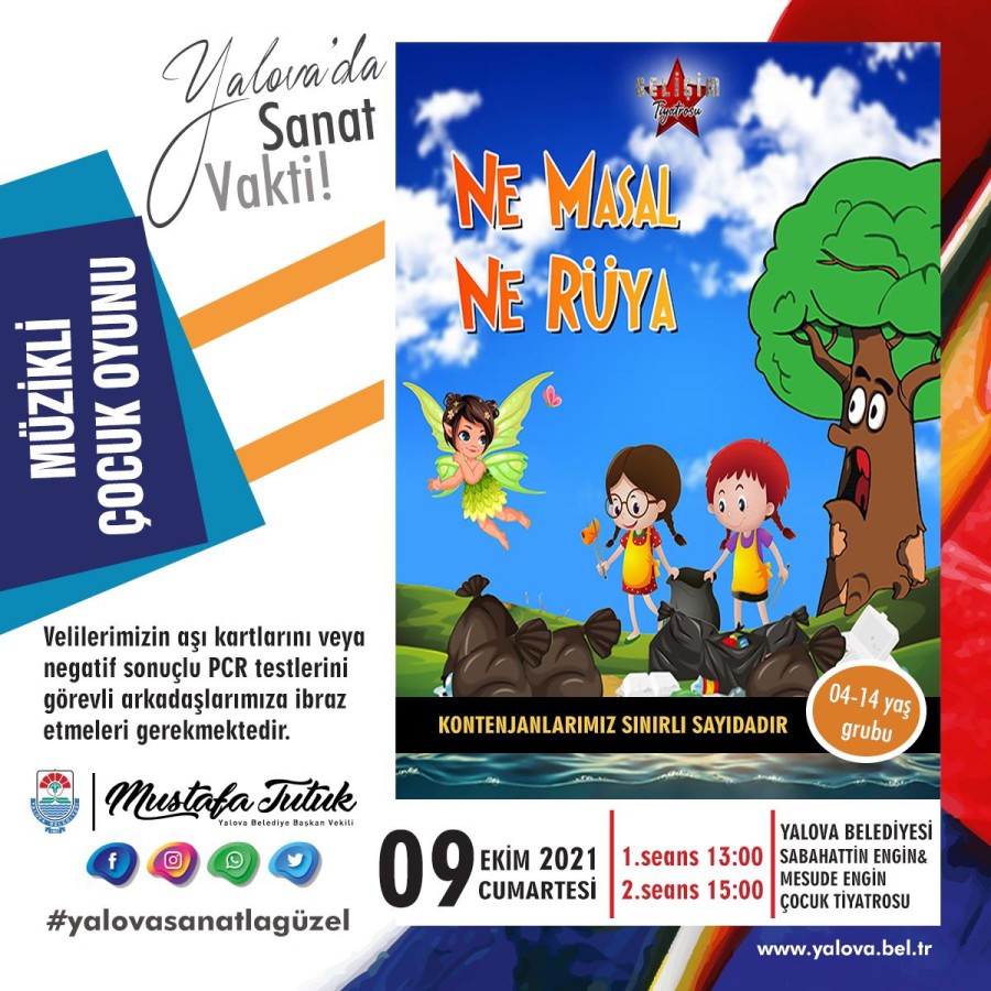 Yalova Belediyesi’nin çocuklar için düzenlediği tiyatro etkinlikleri tüm hızıyla devam ediyor. Bu hafta “Ne Masal Ne Rüya” müzikli çocuk oyunu 9 Ekim Cumartesi günü çocuklarla buluşacak. Yalova Belediyesi Sabahattin Engin ve Mesude Engin Çocuk Tiyatrosu ve Kütüphanesi’nde ücretsiz olarak gerçekleşecek oyun, 4-14 yaş arası çocukları kapsayacak. İki seans olarak 13.00 ile 15.00 de gerçekleşecek. Katılım pandemi nedeniyle sınırlı sayıda olacak. Tiyatroya katılacak velilerin aşı kartlarını veya negatif sonuçlu PCR testlerini görevli personellere ibraz etmeleri gerekmektedir. Başvuru olmadan giriş yapılmayacaktır. Başvuru için; https://bit.ly/3ywL6WF