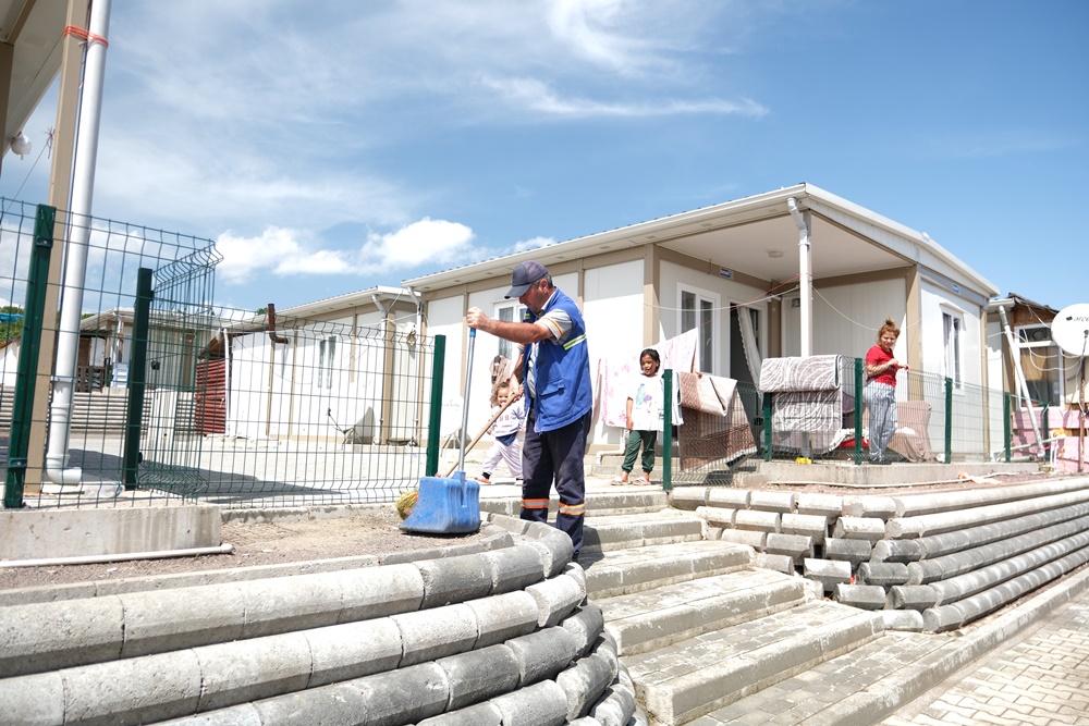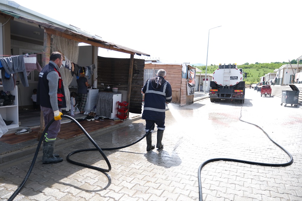 Yapılan süpürge çalışmalarının ardından ekipler, konteyner kent içinde ve çevresinde bulunan konteynerleri dezenfekte ettikten sonra sabunlu sıcak sularla yıkadı. Yapılan tüm çalışmaların ardından konteyner kent ve çevresi tazyikli sularla yıkandı.