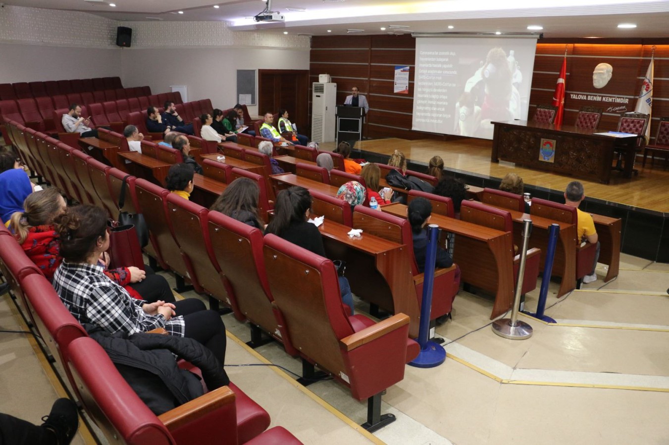 Yalova Belediyesi, Çin’de ortaya çıkan ve tüm dünyayı etkisi altına alan Korona (Covid-19) virüsüne karşı personele yönelik eğitim semineri düzenledi. Dinçer İlhan Belediye Meclis Salonu’nda düzenlenen eğitim seminerinde Dr. Mehmet Çıracı tarafından temizlik ve hijyenin önemi anlatıldı. Seminerde ayrıca korona virüsünün bulaşma yolları, korunma yolları ve bu gibi durumlarda yapılması gerekenler hakkında bilgiler verildi. Slayt eşliğinde verilen eğitimde belediye personelinin daha bilinçli ve tedbirli davranmaları noktasında da uyarılarda bulunuldu. Belediye Meclis Salonu Dezenfekte Edildi Salgın hastalıklara karşı önlemini arttıran Yalova Belediyesi, düzenlenecek seminer öncesinde belediye meclis salonunu ilaçlayarak dezenfekte etti. Ekipler, vatandaşların yoğun olarak kullandığı ortak kullanım alanlarında dezenfeksiyon işlemlerine devam edileceğini belirtti.