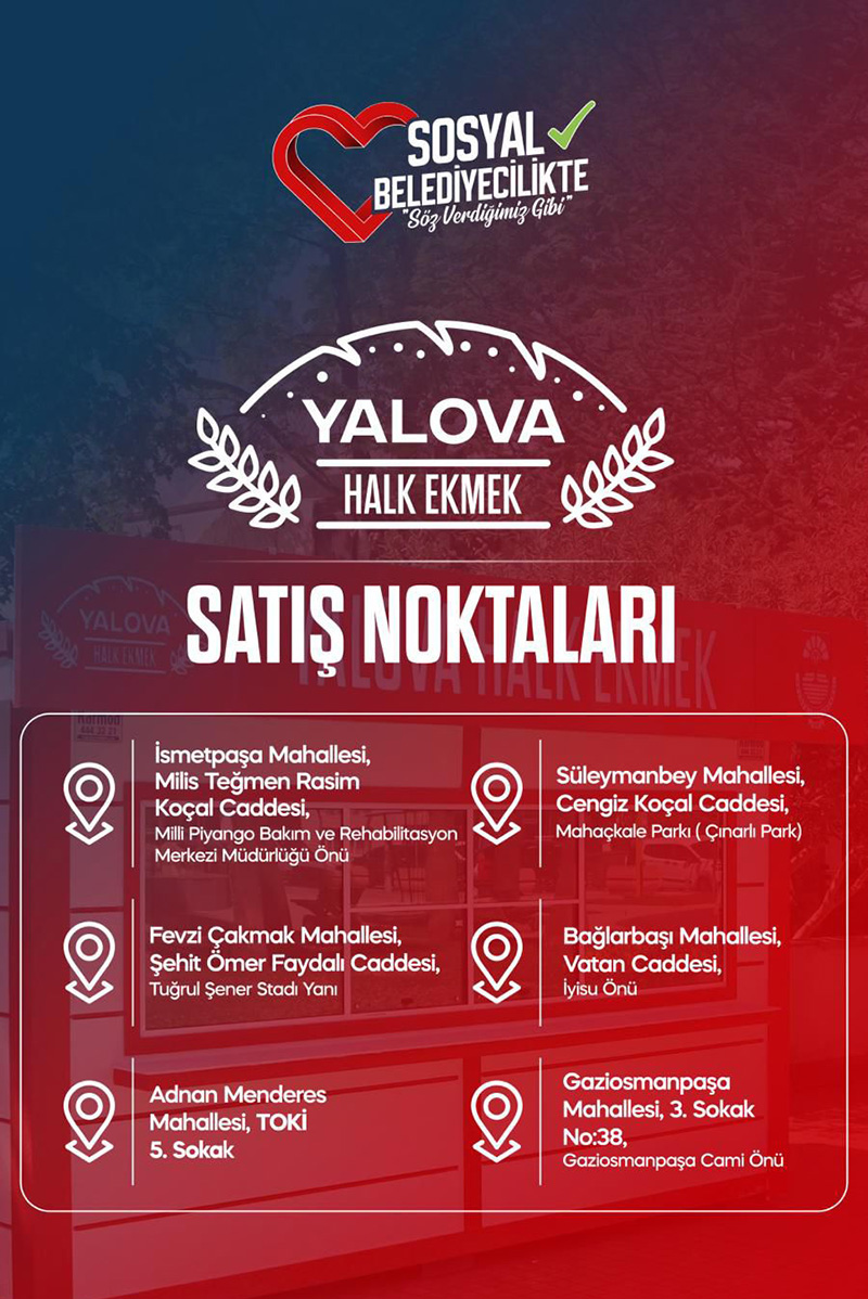 Yalova Belediye Başkanı Mehmet Gürel’in öncülüğünde, kent genelinde hizmet veren Halk Ekmek satış noktaları her geçen gün yaygınlaştırılarak vatandaşlarımızın kolay erişimi sağlanmaktadır.