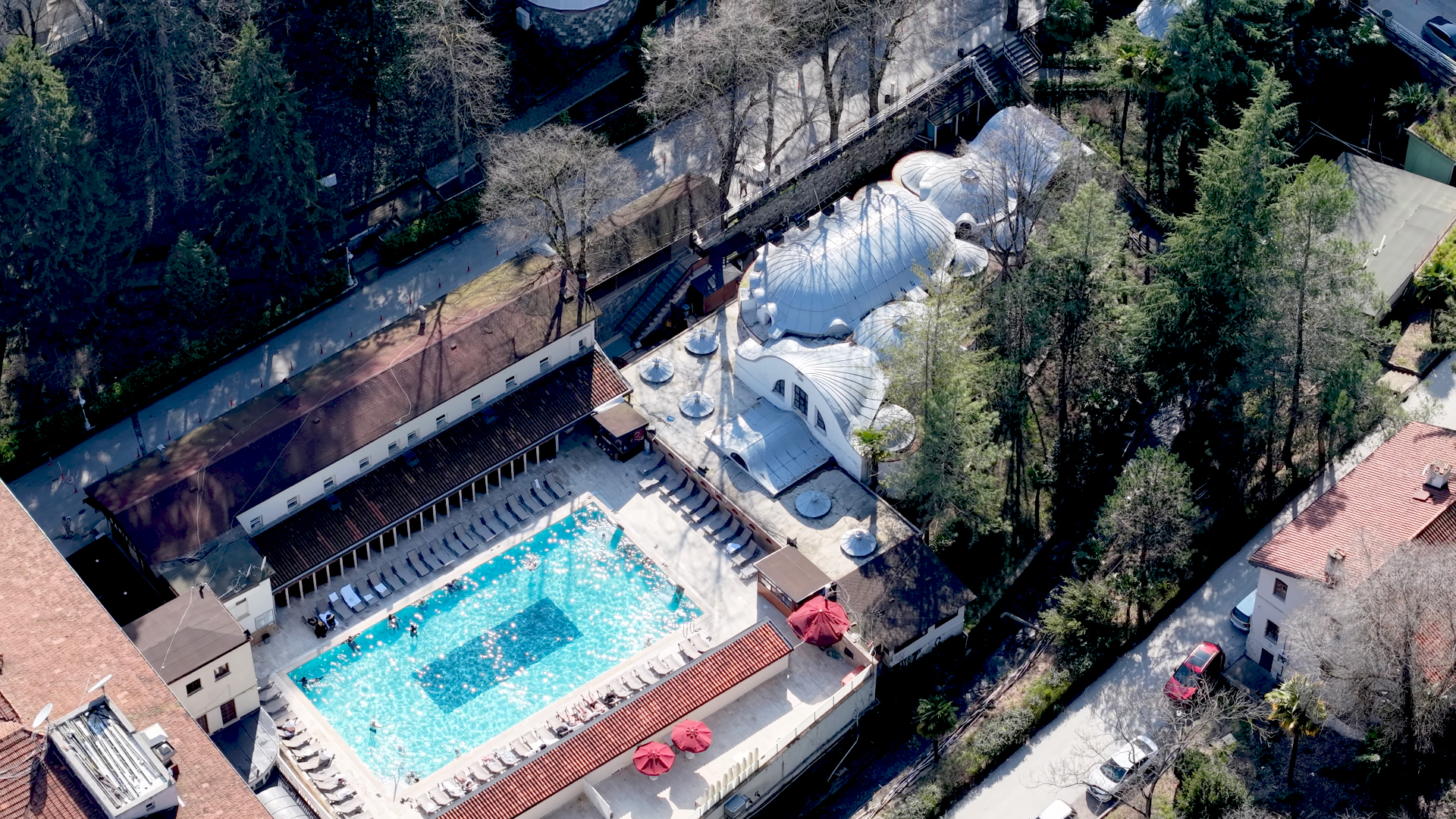 • Açık Havuz, Kurşunlu Banyo, Valide Banyo, Sultan Banyo ve Sıra Banyolar tesisin başlıca bölümleridir.